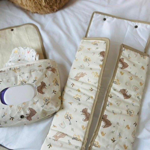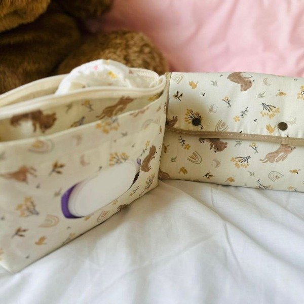 🌎❤️Neceser diseñado para guardar los elementos esenciales a la hora del cambiado. Posee dos bolsillos, uno externo para las toallitas húmedas (con abertura en el centro e interior impermeable), y el principal, para guardar pañales, oleo y demás elementos necesarios. Cierre con solapa.