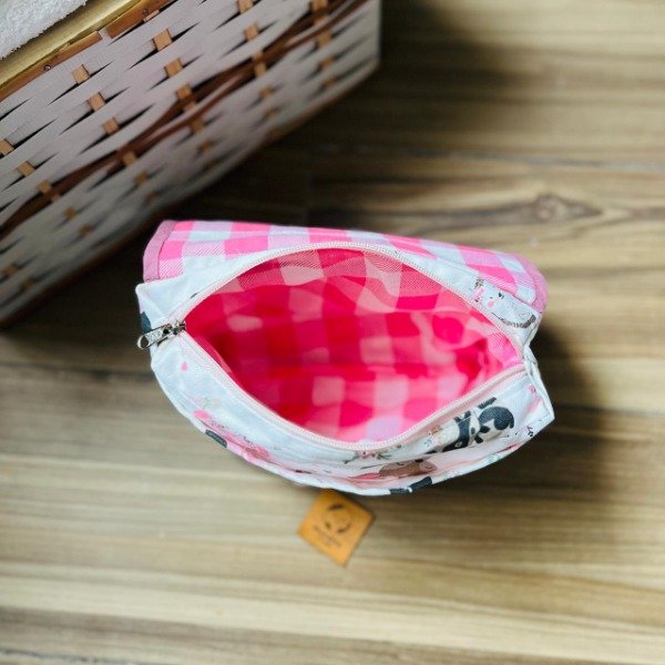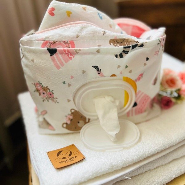 Neceser diseñado para guardar los elementos esenciales a la hora del cambiado. Posee dos bolsillos, uno externo para las toallitas húmedas (con abertura en el centro e interior impermeable), y el principal, para guardar pañales, oleo y demás elementos necesarios. Cierre con solapa.