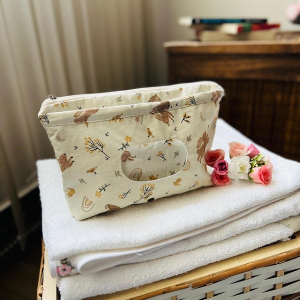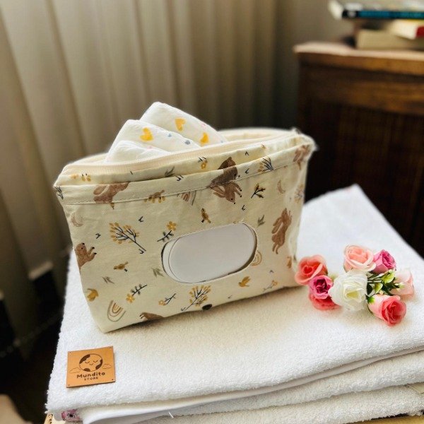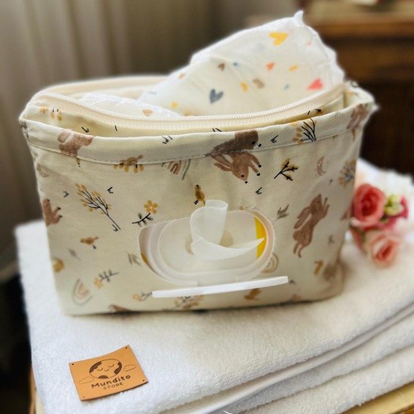 Neceser diseñado para guardar los elementos esenciales a la hora del cambiado. Posee dos bolsillos, uno externo para las toallitas húmedas (con abertura en el centro e interior impermeable), y el principal, para guardar pañales, oleo y demás elementos necesarios. Cierre con solapa.